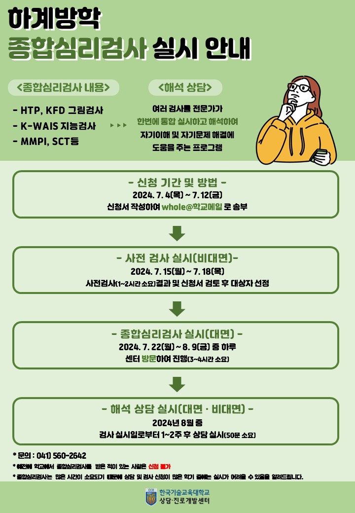 [교내활동] [상담·진로개발센터] 하계방학 종합심리검사 안내(지능검사, 그림검사 등)